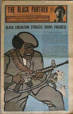 The Black Panther newspaper showed photographic evidence of police brutality along with editorial drawings and cartoons illustrating black people fighting back.